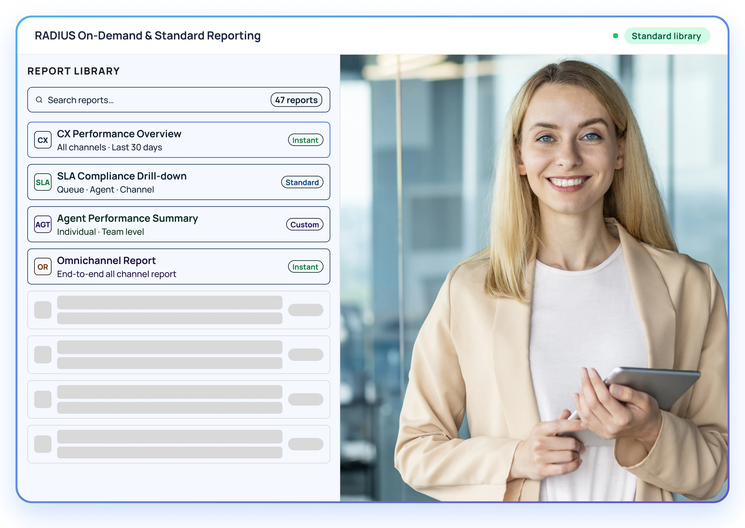 Generate reports instantly to answer ad-hoc business questions with on-demand reporting, while accessing a comprehensive library of ready-to-use standard reports aligned with contact center best practices. Drill down across channels, agents, queues, SLAs, and customer journeys.